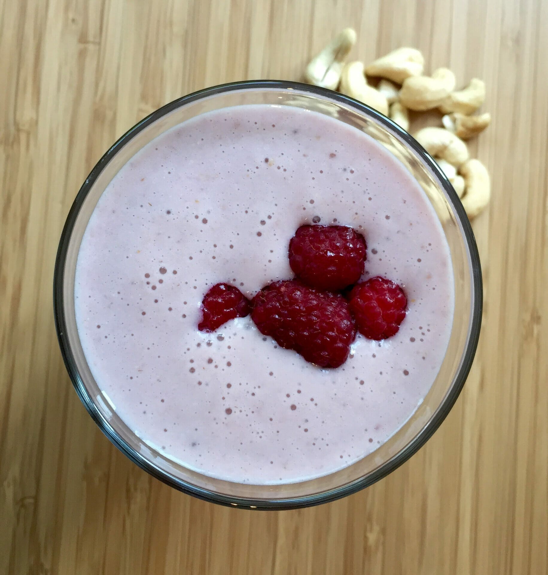 Remoja los anacardos durante 2 horas y escúrrelos. Coloca todos los ingredientes en la batidora de vaso y mezcla lentamente al principio, y luego aumenta la velocidad y mezcla durante 45-60 segundos hasta que esté suave.