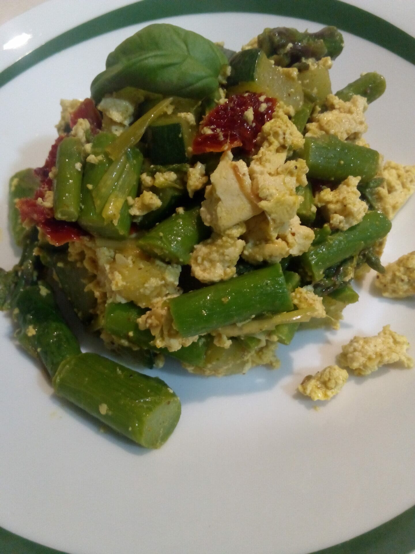 Ponemos en la sartén las verduras y los tomates troceados con un poco de aceite y con un chorro de agua. Rehogar con agua es muy sano y mantiene el sabor de los alimentos. Cuando estén las verduras tiernas añadir el tofu desmigado con las manos y la curcuma (o el curry) para darle color. Seguir rehogando 3 ó 4 minutos, removiendo para que se mezclen los sabores.